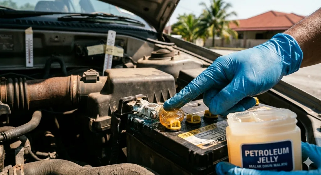 Langkah Pencegahan: Sapukan sedikit petroleum jelly atau gris pada terminal untuk mengelakkan kakisan berulang.
